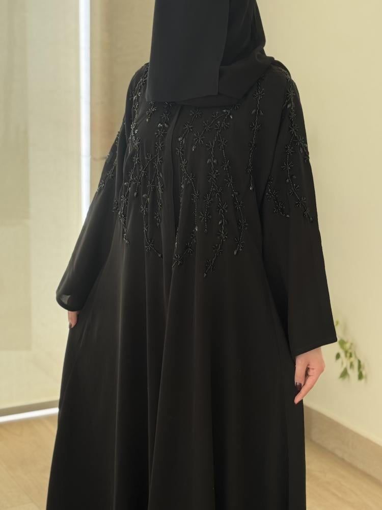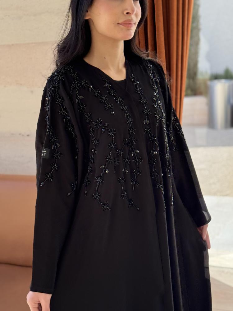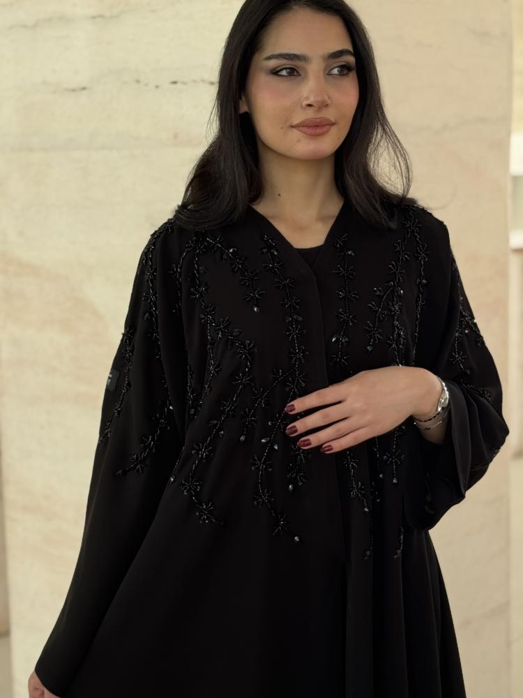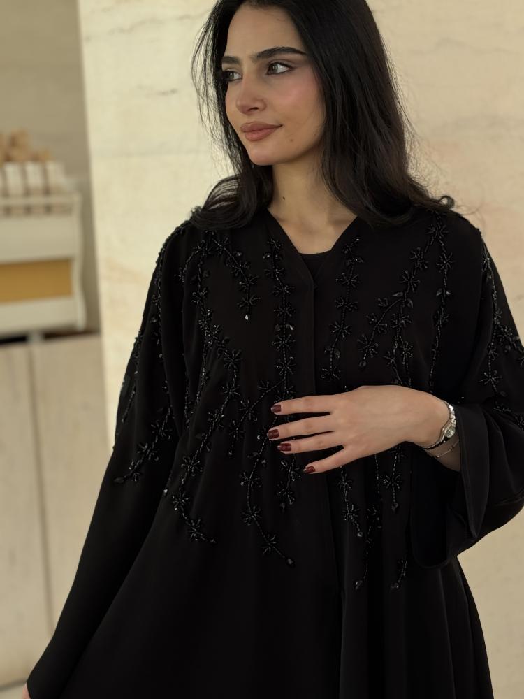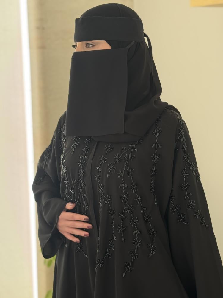 "استمتعي بالكمال في كل لمسة. عباية الشهد مصنوعة من أجود أنواع الأقمشة، وتتميز بتفاصيل دقيقة تعكس الذوق الرفيع. كل قطعة من هذه العباية تحكي قصة من الفخامة والأناقة."والأكمام اللامعة بحواف مرسومه بحرفية عالية.