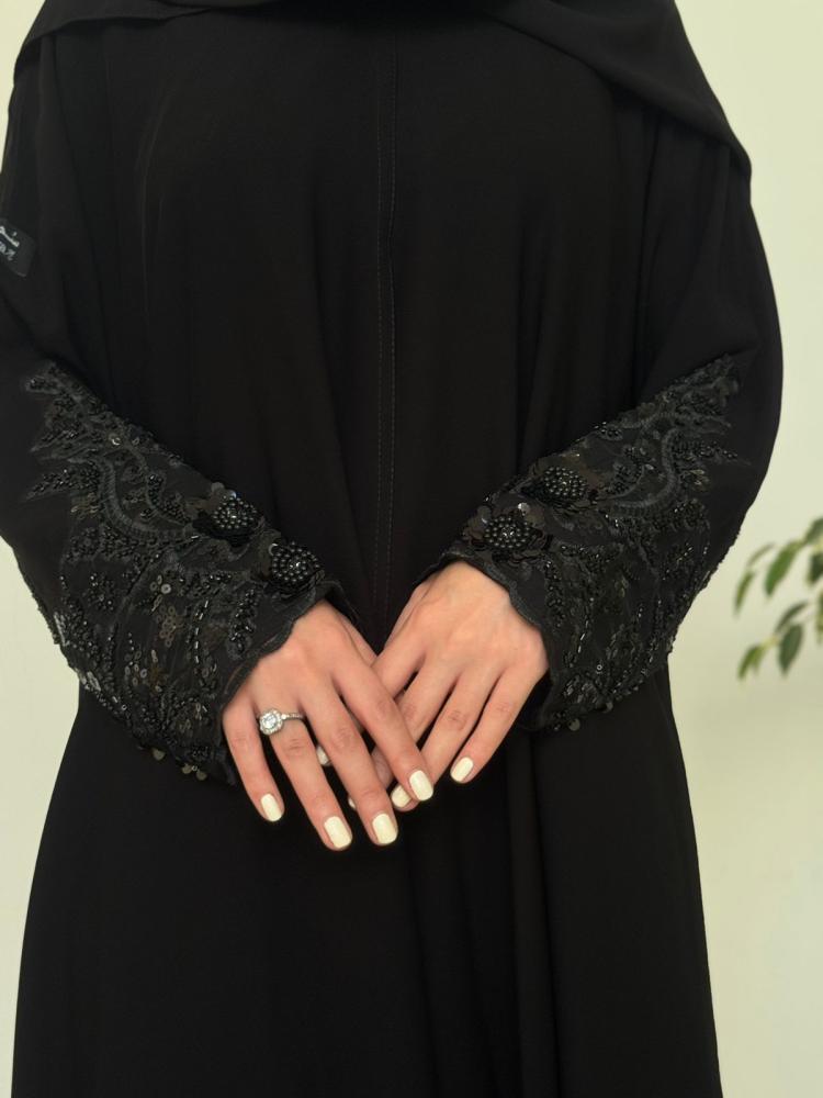 "استمتعي بالكمال في كل لمسة. عباية الهنوف مصنوعة من أجود أنواع الأقمشة، وتتميز بتفاصيل دقيقة تعكس الذوق الرفيع. كل قطعة من هذه العباية تحكي قصة من الفخامة والأناقة."والأكمام اللامعة بحواف مرسومه بحرفية عالية.